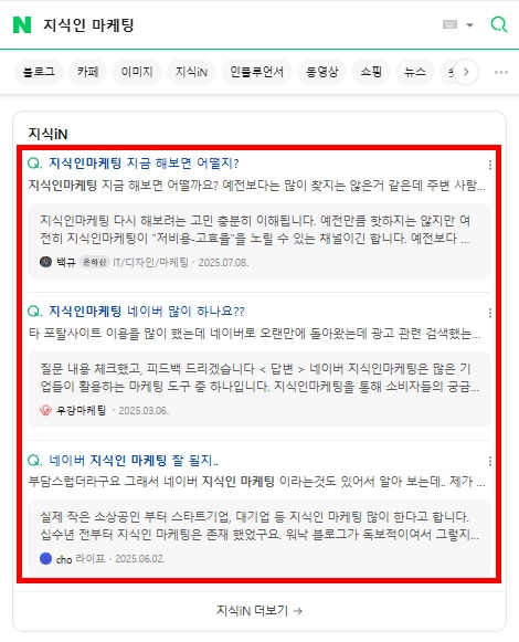 키워드를 검색했을 때, ‘지식iN’ 영역 내에
