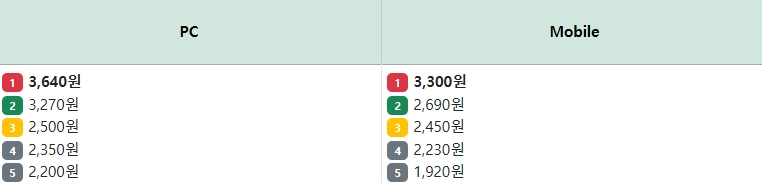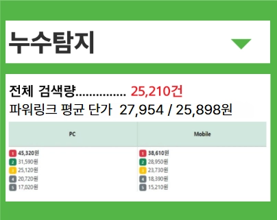 PC와 모바일 기준, 평균 CPC 입찰가는 2,820원, 2,546원입니다.