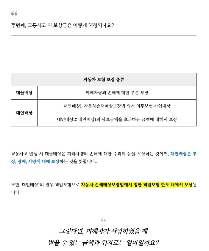 복잡한 법률용어 및 대물/대인보상 등의 전문 용어를 표로 정리하였습니다.